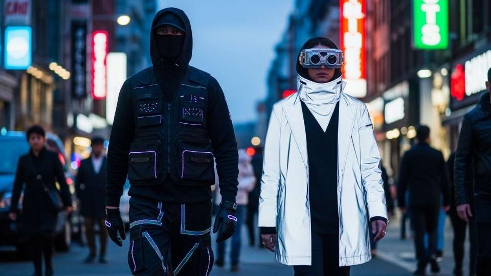 Utility vests, cargo pants with blinking strips, and goggles that look like they came off a Mars rover popped up almost overnight. The vibe is half military, half sci-fi, and all conversation starter.